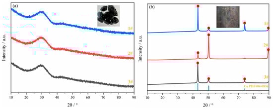 XRD patterns of the products: (a) glass slag; (b) Cu-PGMs alloy.