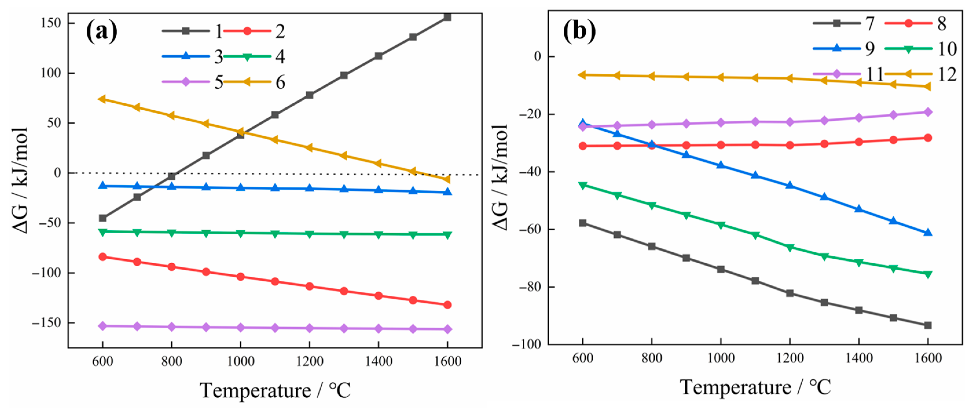 The thermodynamic data for the above reaction were calculated using Factsage 7.0. The relationship between Gibbs free energy (ΔG) and temperature is shown in Figure 1. As shown in Figure 1a, Pd undergoes an oxidation reaction with oxygen at low temperatures (600~800 °C) to form the corresponding oxide, PdO. This phenomenon occurs because PGMs’ oxides are thermodynamically more stable at lower temperatures. The oxidation reaction provides intermediate products (oxides) for subsequent reduction and alloying processes, facilitating the reduction in PGMs to their metallic state by reducing agents. A melting temperature above 800 °C indicates that the formation of PGMs’ oxides during the smelting process is inevitable. Even at a relatively low temperature, PdO undergoes a reduction reaction by C and Cu, and the reduction ΔG by C is lower than that by Cu at the same temperature. Therefore, PdO is first reduced by C and then by Cu. This indicates that during the copper smelting and collection process, PdO is particularly prone to reduction to the elemental form. PdS may undergo oxidation reactions with O2 or reduction reactions with C. However, the results show that the ΔG of the reduction reaction is significantly lower than that of the oxidation reaction, indicating that PdS is preferentially reduced by C. For Reaction (6), when the temperature exceeds 1500 °C, ΔG < 0. This indicates that a reduction reaction of SiO2 occurs when the melting temperature surpasses 1500 °C, resulting in the formation of silicon (Si) impurities. To prevent the reduction of SiO2, the smelting temperature should be controlled not to exceed 1500 °C. Reactions (7)~(12) indicate that Pd is more easily reduced as the temperature rises. Therefore, the smelting temperature is set between 1350 °C and 1500 °C to ensure the reduction in PGMs while simultaneously preventing the formation of Si.