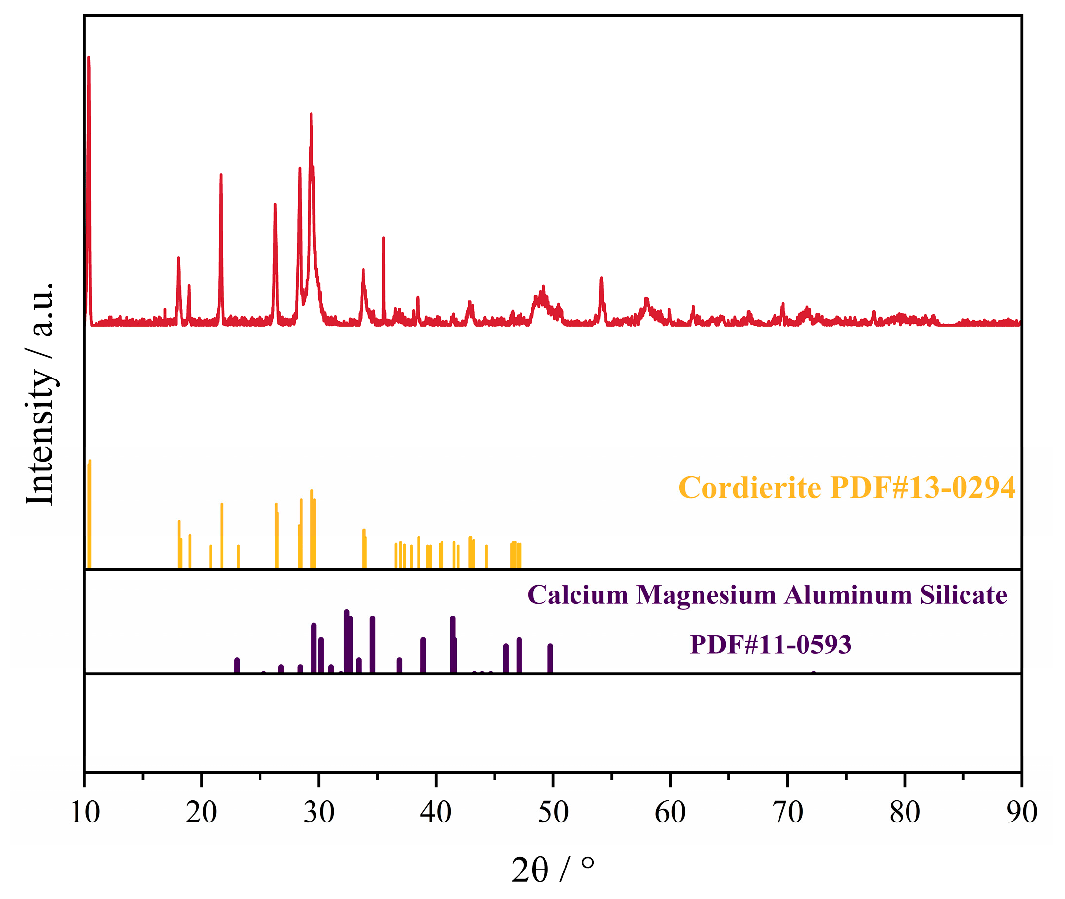 The SAC used in this experiment was provided by a precious metals recycling company in China. Figure 2 shows the XRD (D8 ADVANCE, BRUKER AXS GMBH, 8°/min) pattern of SAC. As can be seen, the main component of SAC is cordierite (PDF#13-0294). To increase the recovery rate of PGMs, it is necessary to reduce the content of PGMs in the slag phase as much as possible and improve slag–metal separation situation, both of which are related to the slag viscosity. At the same time, the smelting temperature should be reduced as much as possible to achieve low-temperature copper capture. This not only reduces energy consumption but also extends the service life of the equipment.