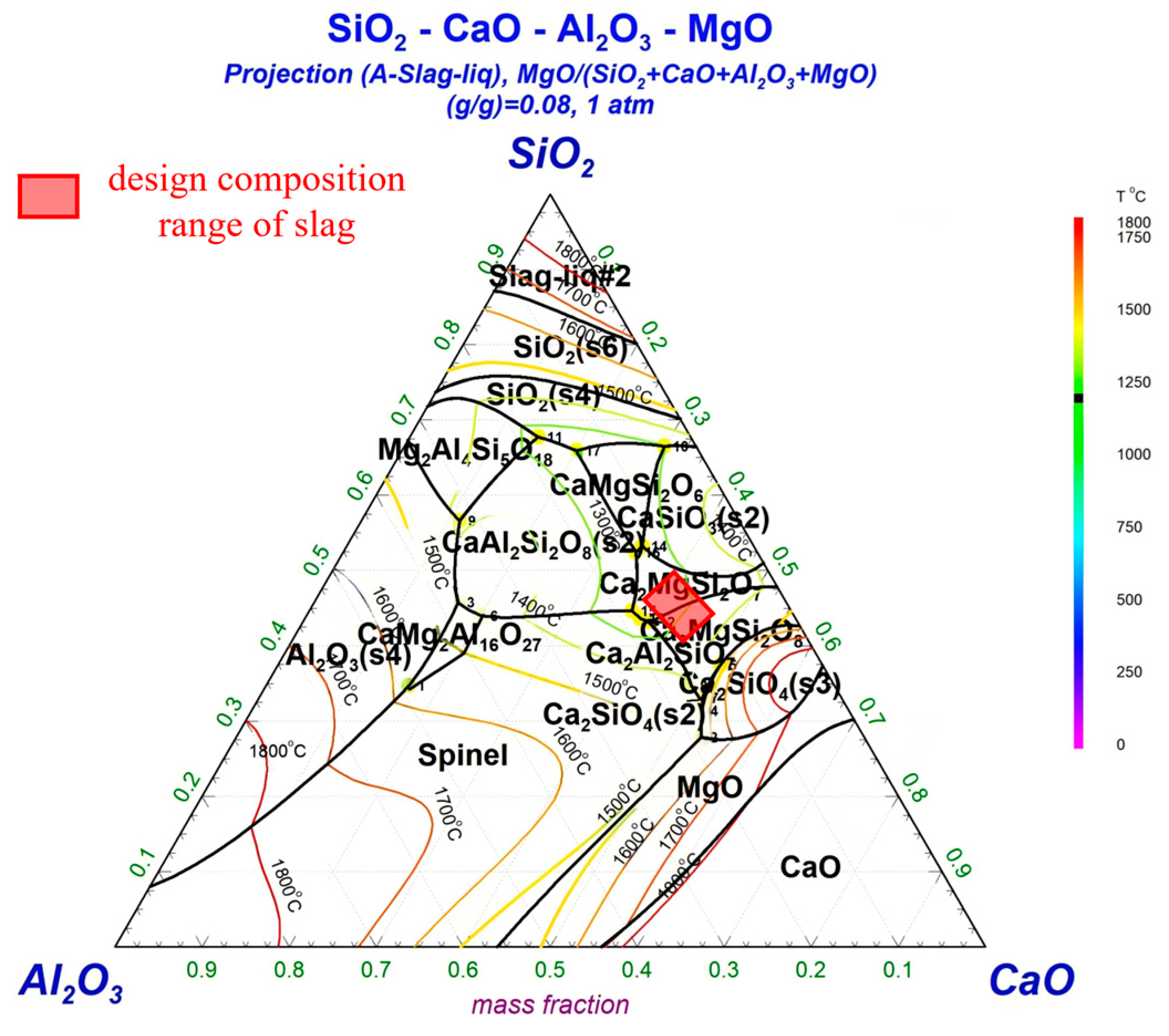 Figure 3. CaO-Al2O3-SiO2-MgO pseudo-ternary phase diagram.