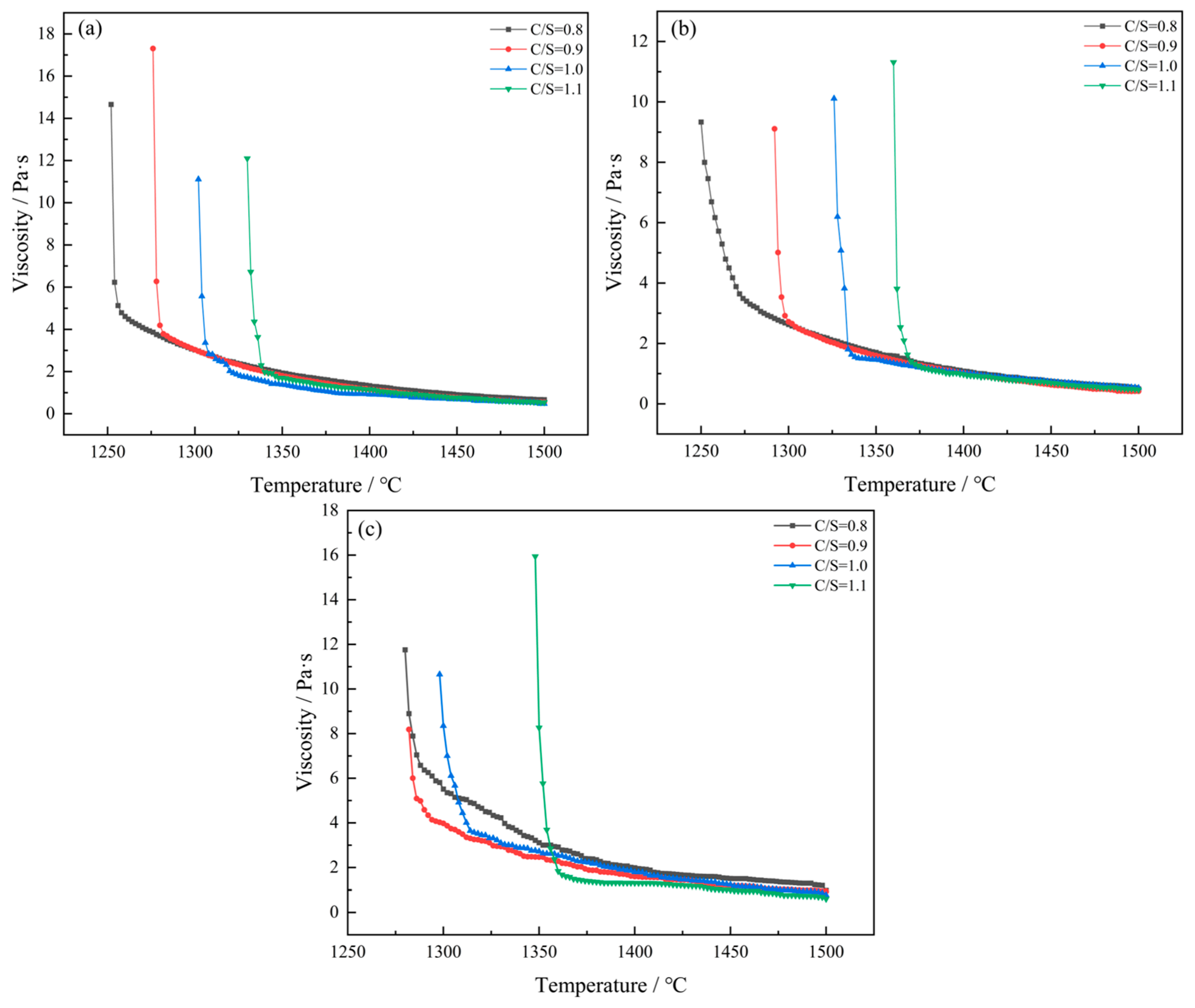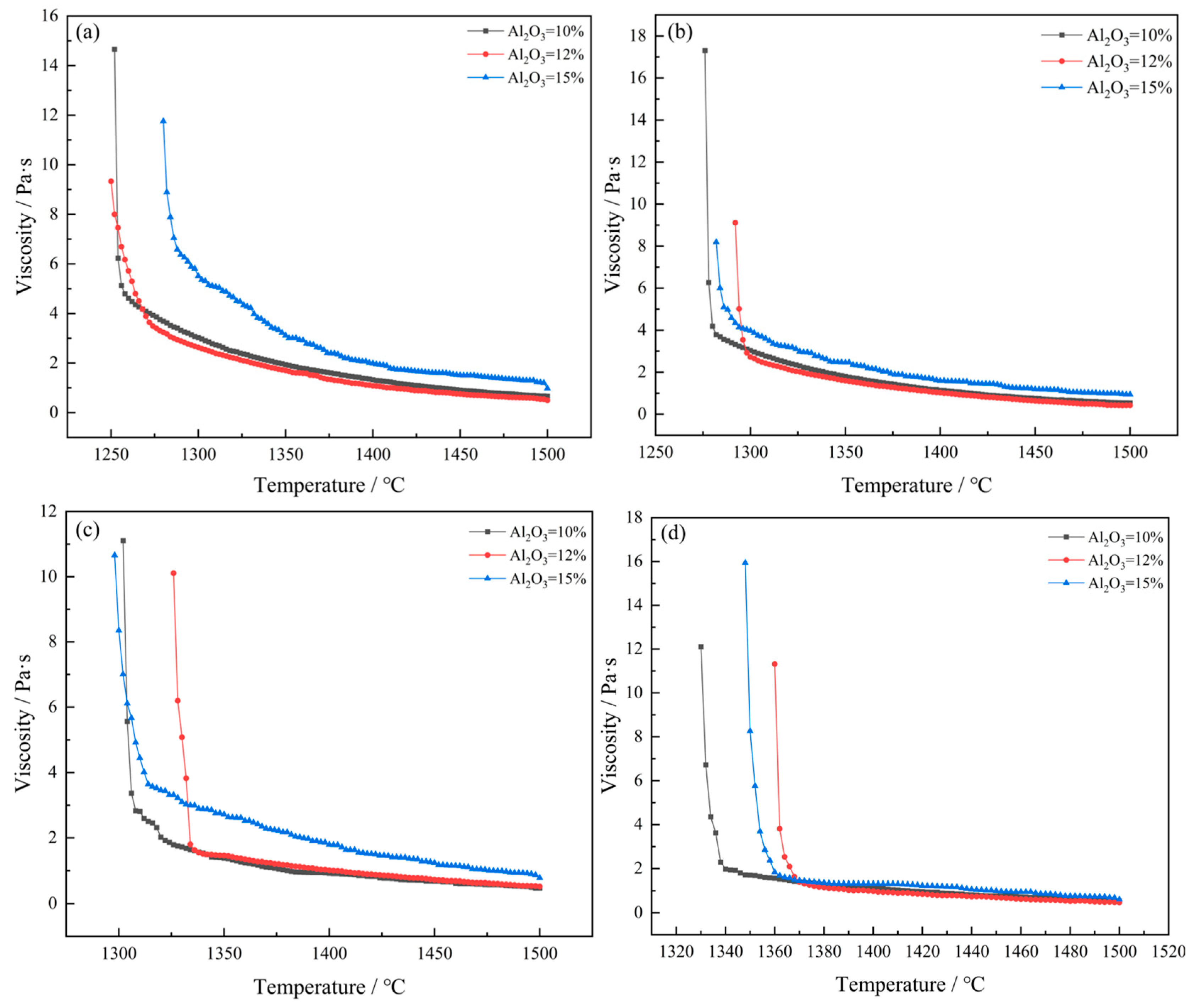 Figure 4a–c shows the viscosity–temperature curves with different mass ratios of CaO/SiO2 under the condition of a fixed Al2O3 content. The figure shows that, as temperature rises, slag viscosity gradually decreases. This is because when the temperature rises, excessive heat energy will also damage the original slag structure, reducing the viscosity of the slag [20].