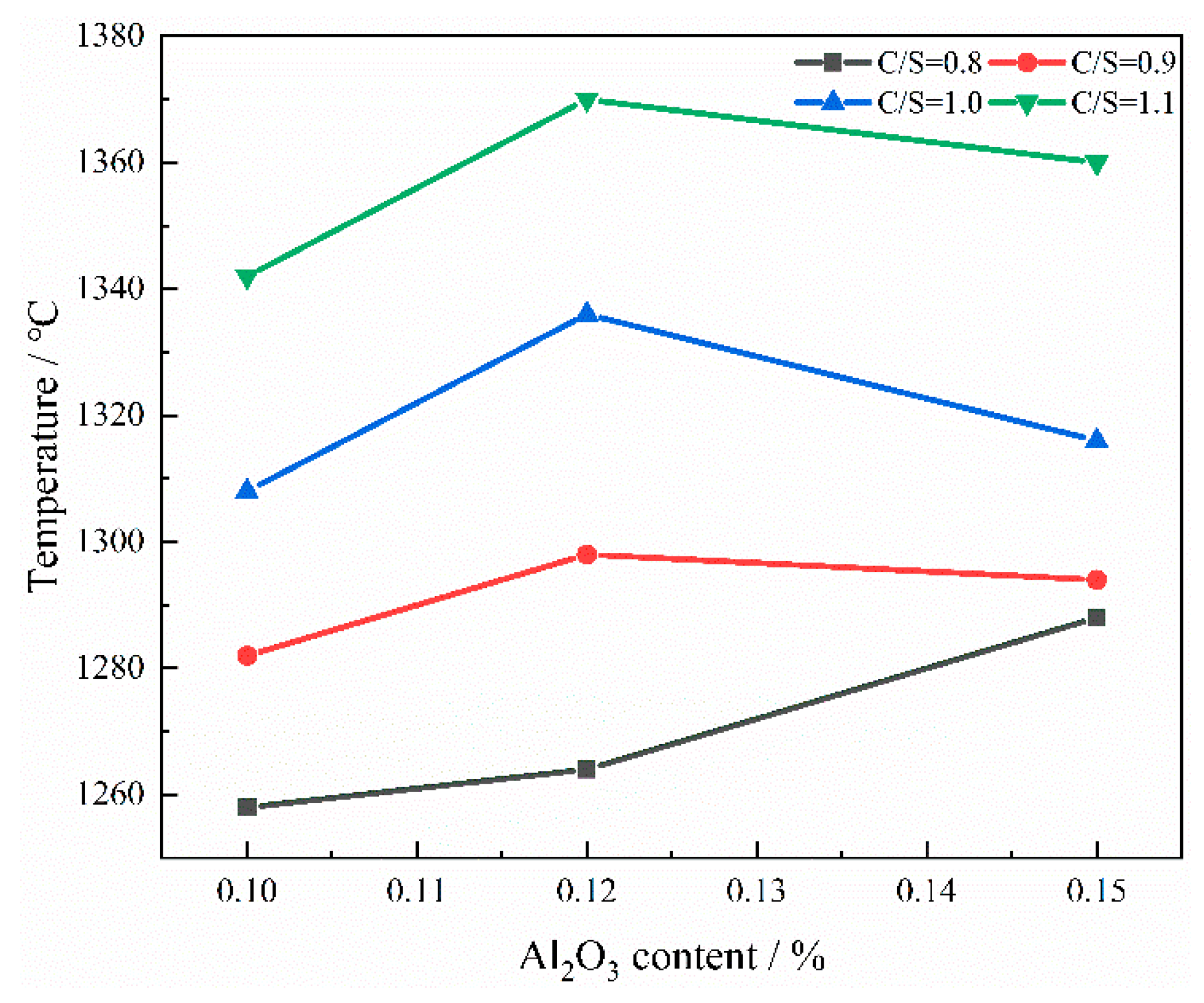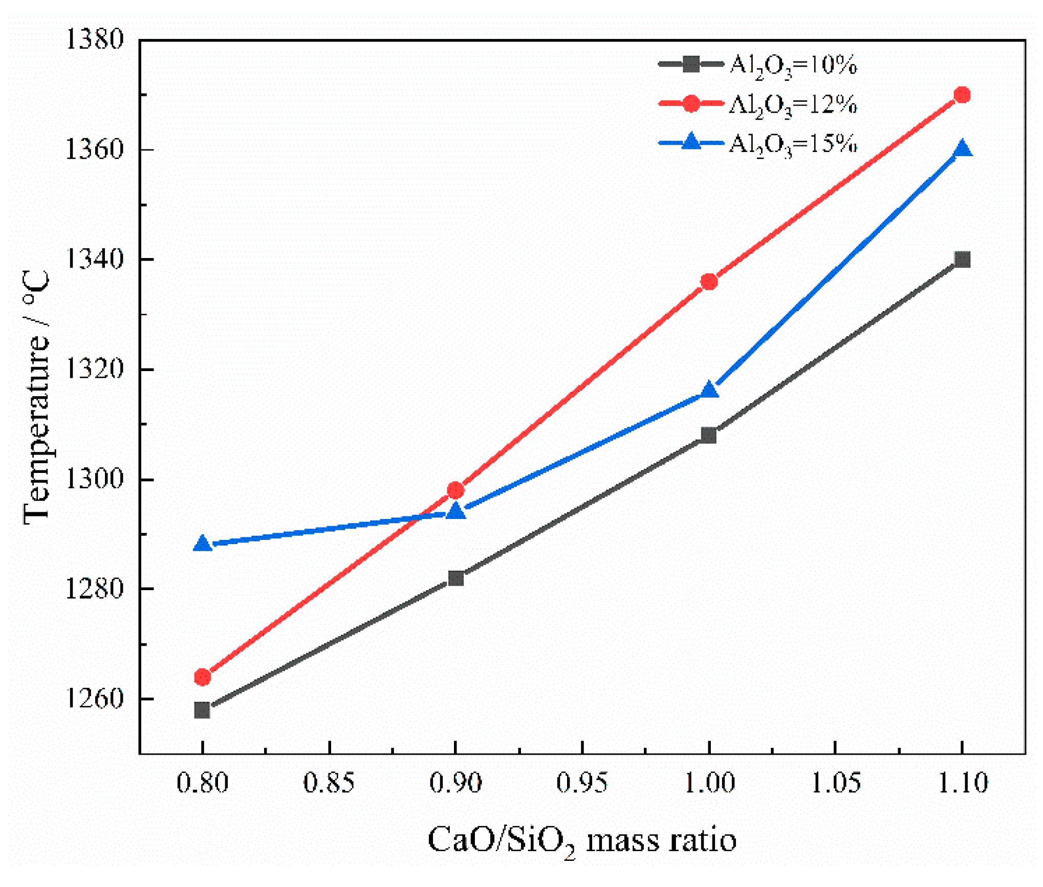 Figure 5 shows the curve of TBK as a function of the CaO/SiO2 mass ratio for different Al2O3 contents. At different Al2O3 contents, TBK increases with increasing CaO/SiO2 mass ratio. The maximum increase occurs at 12 wt% Al2O3, where TBk rises from 1264 °C to 1370 °C. This is due to the high melting point of CaO and the formation of substances such as Ca2SiO4 (melting point 2130 °C). When the mass ratio of CaO/SiO2 increases from 0.8 to 1.1, the total amount of high-melting-point phases in the slag increases, and the crystallization ability of the slag at high temperatures also increases. Therefore, the TBK increases accordingly.