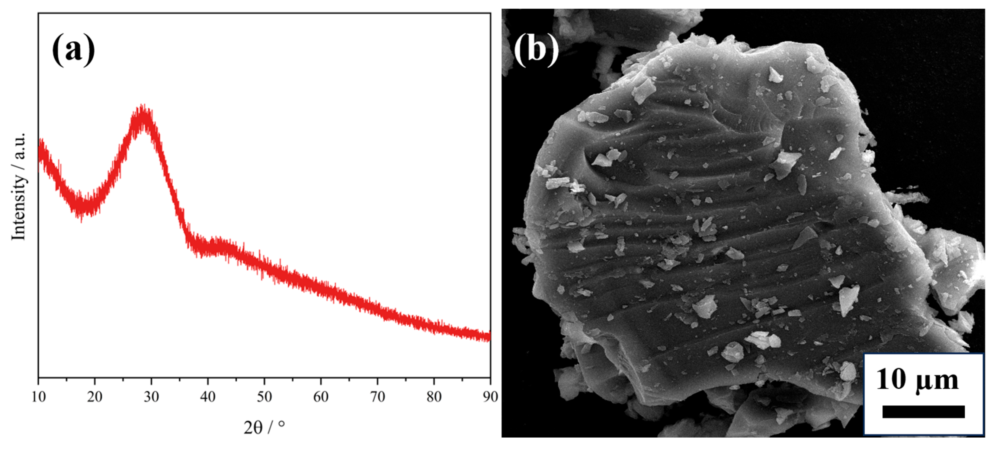 Figure 8. Characterization of the target slag system: (a) XRD pattern; (b) SEM image.