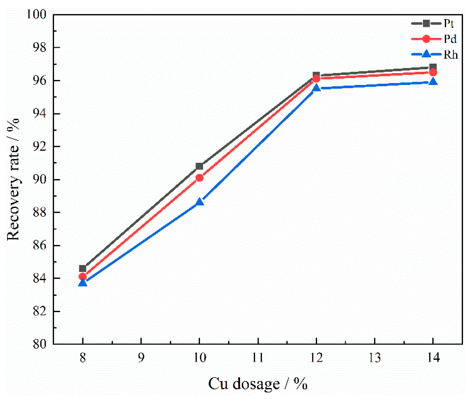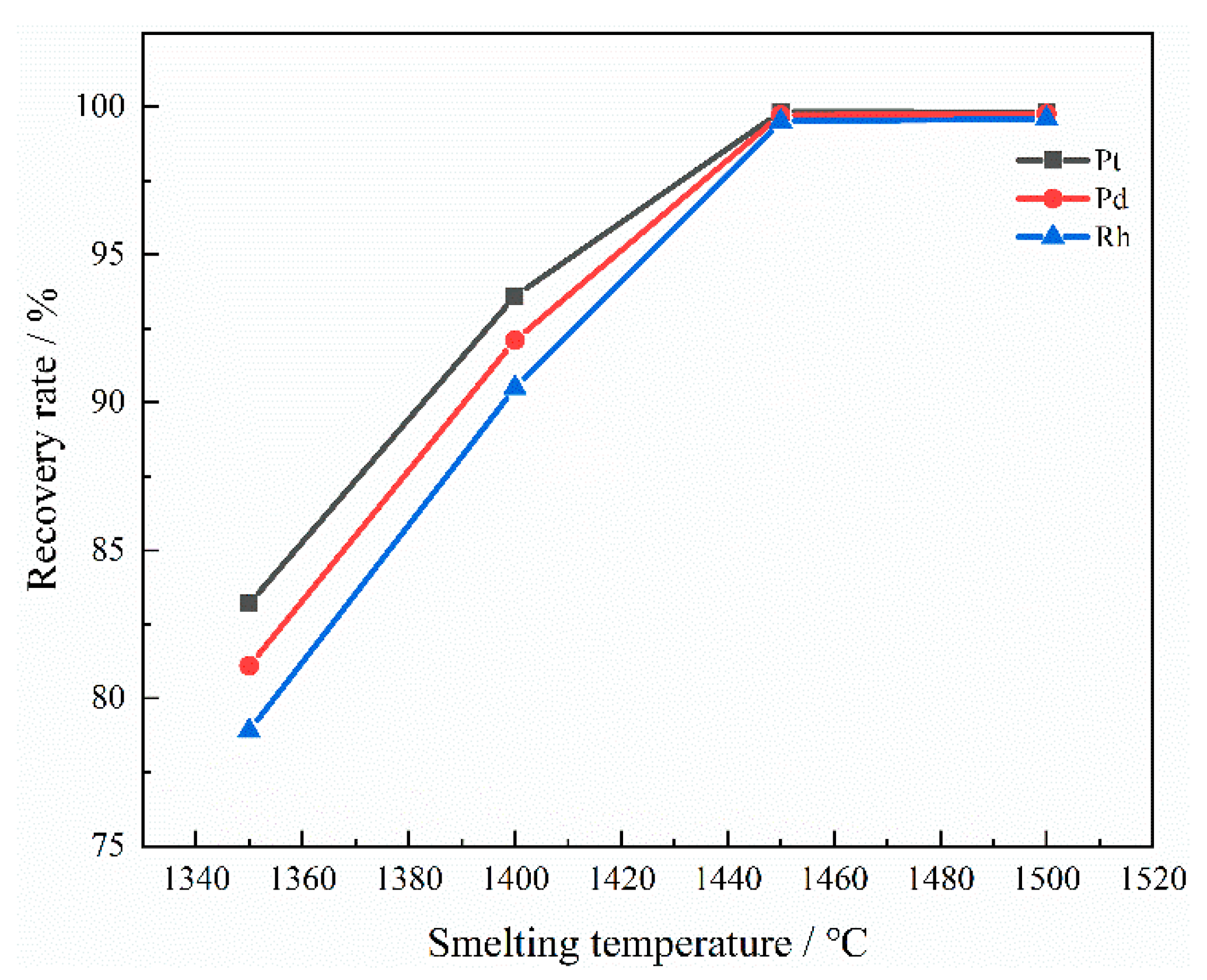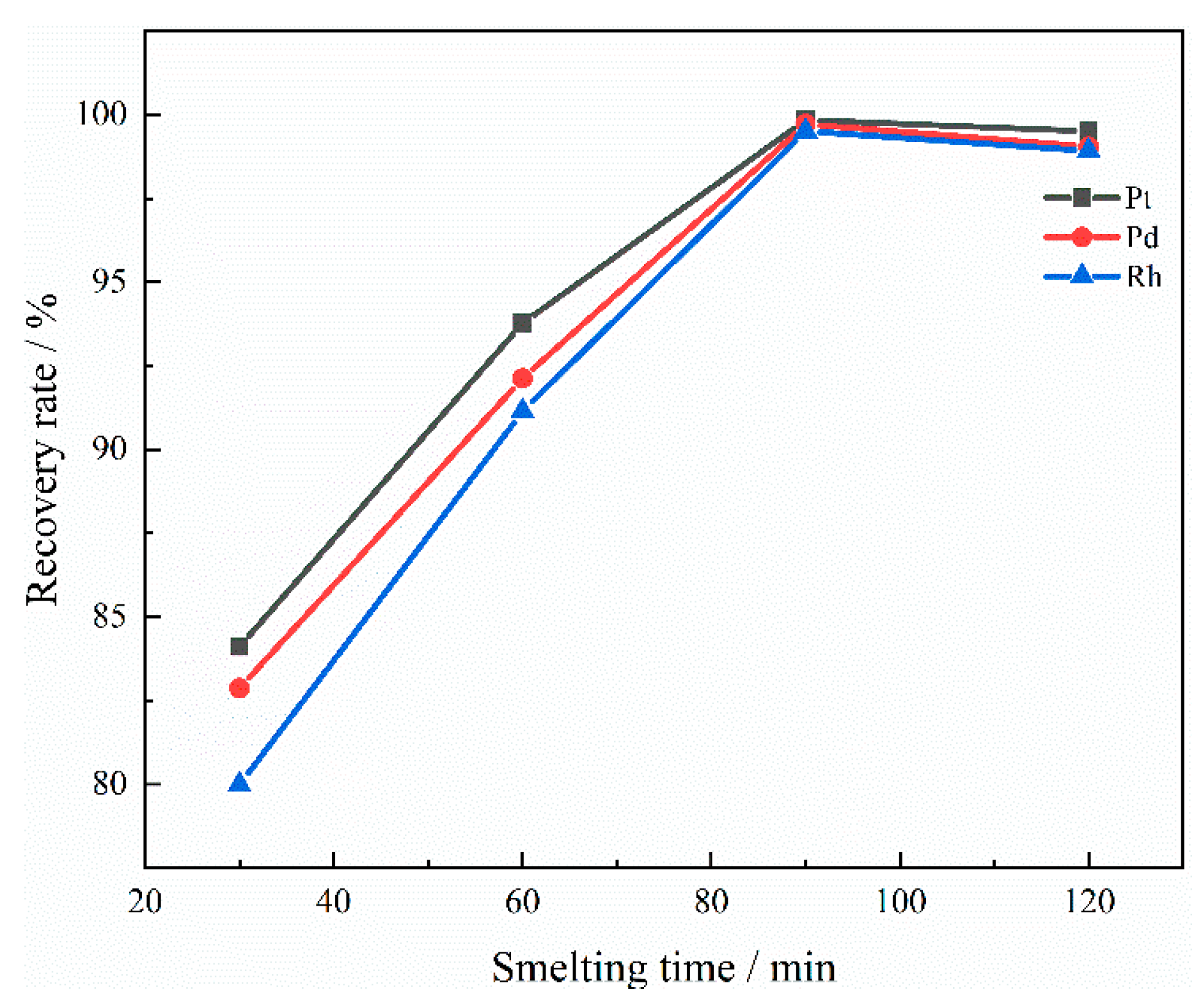 As shown in Figure 14, when the smelting time is 30 to 60 min, the recovery rate increases significantly. When the smelting time was 90 min, the recovery rate reached its maximum, indicating that the optimal reaction conditions were achieved. However, as smelting time continued to increase, the recovery rate of PGMs decreased slightly. This is attributed to the fact that the recycling process is carried out in an air environment. The Cu-PGMs alloy is prone to oxidation and mixing into the slag in an air environment, resulting in a slight decrease in the recovery rate of PGMs. Moreover, an excessively long smelting time will increase the solubility of PGMs in the slag.