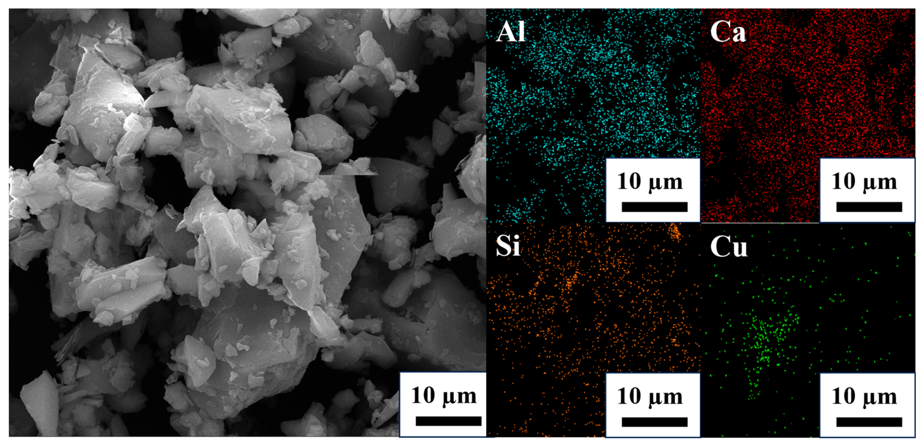As can be seen from Figure 9, when the dosage of the collector Cu is 8%, Cu cannot fully contact the PGMs, thus resulting in a very small recovery rate of Pt, Pd, and Rh, not exceeding 85%. When the amount of metal to be captured is 10 to 12 wt%, the recovery rate significantly increases compared to 8 wt%. This indicates that increasing the amount of the collector can effectively enhance the contact and collection probability of copper with PGMs, thereby significantly improving the recovery efficiency of PGMs. When the captured metal amount reached 12 wt%, the recovery rates for Pt, Pd, and Rh were 96.3%, 96.12%, and 95.52%, respectively. When the Cu content was 14 wt%, the recovery rate did not change much. This phenomenon might be due to excessive Cu use, which led to collector aggregation and reduced the effective contact surface area. From the SEM image and EDS spectrum of the slag at a Cu dosage of 14 wt% presented in Figure 10, it can be observed that, in contrast to the uniform distribution of Al, Ca, and Si within the slag matrix, Cu exhibits a certain degree of aggregation. Moreover, the increased Cu dosage did not correspondingly increase the number of PGMs that could be collected. Additionally, considering the relatively high price of Cu, excessive use of Cu not only increases the production costs. Moreover, it increased the difficulty of separation in the subsequent smelting process. Eventually, it was determined that the amount of copper collector added to the SAC was 12 wt%.