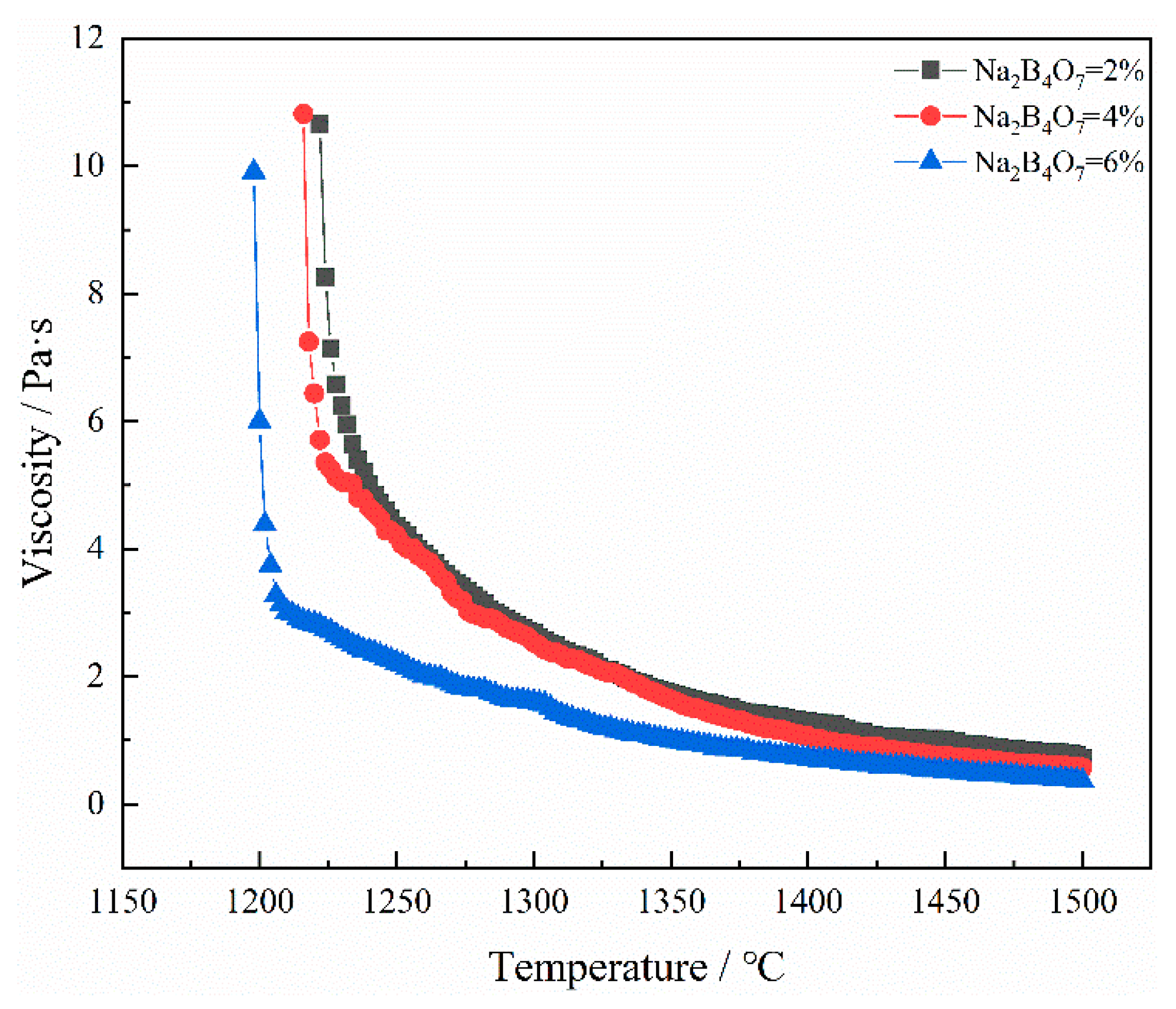 The viscosity of the captured slag was tested, and the results are shown in Figure 12. With the addition of Na2B4O7, the viscosity of the slag decreases. At 1450 °C, the addition of Na2B4O7 resulted in a decrease in the slag viscosity from 1.0111 Pa·s to 0.52 Pa·s. This is because it decomposes into Na2O and B2O3 when heated. The increase in Na2O content will lead to depolymerization of the slag network, thereby reducing its structural complexity. Therefore, the fluidity of the slag is improved and its viscosity is reduced [24]. The addition of B2O3 will produce a [BO3]3− regular trihedron. This leads to simplification of the slag structure and a reduction in slag viscosity [25]. After comprehensive consideration, the additional amount of Na2B4O7 was determined to be 4 wt%.