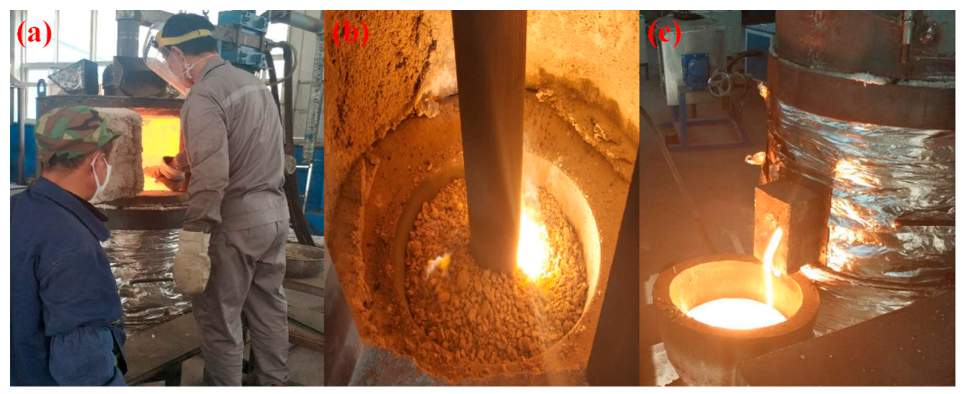 Figure 16. Copper collection experiments on a scale of 30 kg (a) Feeding process; (b) Smelting process; (c) Slag discharge process.