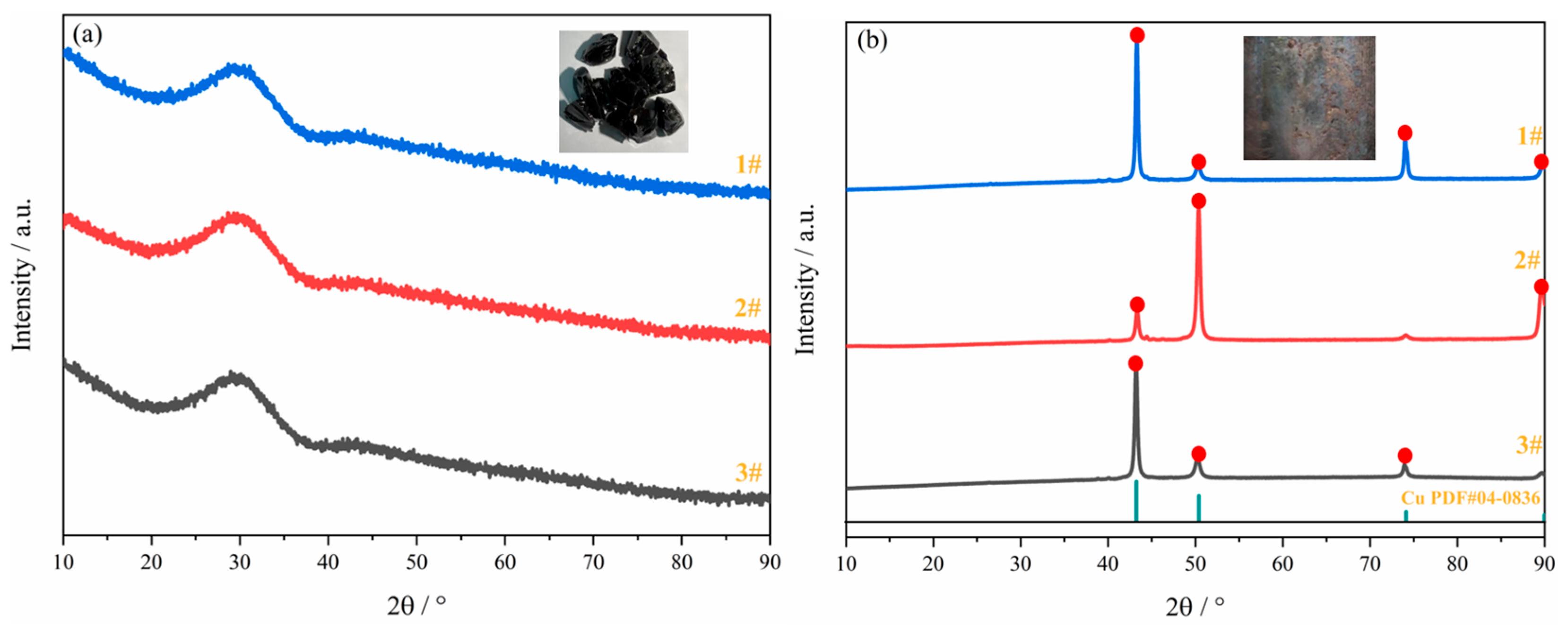 XRD tests were conducted on the three groups of slags and alloys obtained, and the results are shown in Figure 17. As can be seen from Figure 17a, all three slag groups are expected to be amorphous glass slag. As can be seen from Figure 17b, the main crystal phase in the alloy is Cu (PDF#04-0836), and no other impurities have been found. The SEM results in Figure 18 indicate that PGMs have been successfully enriched in the Cu matrix.