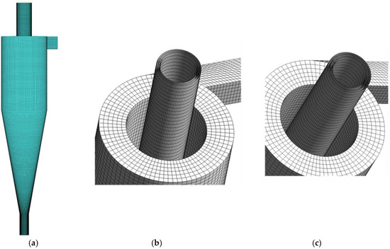 This study employed CFD-FLUENT to conduct a numerical analysis of the flow field and particle classification performance within the hydrocyclone. Before performing numerical analysis on the physical model, mesh generation must first be implemented. Common mesh types include tetrahedral and hexahedral meshes [15,16]. While tetrahedral meshes are simple to partition, they typically offer lower computational accuracy and are usually suitable for large and irregular volumes. In contrast, hexahedral meshes, characterized by high precision and faster computation speeds, are widely used for meshing regular objects. This study adopted Fluent 22.0 for the numerical simulation of hydrocyclones, which was generally divided into two steps. Firstly, the RSM+VOF model was used to conduct numerical analysis of the internal flow field of the hydrocyclone, with the flow field balance at the inlet and outlet as the convergence criterion—the error did not exceed 2%, the residuals were less than 1 × 10−5, the number of operating steps was not less than 60,000, and the operating time was 21 h. Secondly, the RSM+Mixture model was employed for the numerical simulation of the particle phase, taking the flow balance of particles with different sizes at the inlet and outlet as the convergence condition, where the error did not exceed 2%, the operating time was 36 h, and the number of operating steps was 80,000. Therefore, this study utilized ICEM 22.0 to create a hexahedral mesh for the physical model. To capture the subtle flow near the vortex finder, the mesh was refined along the wall surface of the vortex finder, as shown in Figure 2. The number of mesh elements is a key parameter affecting computational accuracy and efficiency. Consequently, to select an appropriate number of mesh elements, a mesh independence verification was conducted, illustrated in Figure 3. Tangential velocity was adopted as the evaluation criterion; when the number of mesh elements exceeded 3.09 × 105, the tangential velocity showed little variation with changes in mesh count, indicating that further increases in mesh quantity would not enhance numerical accuracy. To save computational time, this study selected 3.2 × 105 hexahedral mesh elements as the computing domain units. The convergence condition is based on balancing the inflow and outflow rates.