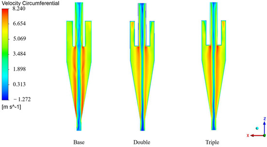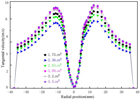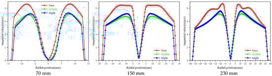 Particle separation in a hydrocyclone primarily relies on centrifugal force and pressure gradient force. When the centrifugal force exceeds the pressure gradient force, particles migrate outward and are discharged from the spigot; conversely, they are discharged from the overflow outlet if the centrifugal force is lower, ultimately achieving particle classification [22,23,24]. The tangential velocity is the highest velocity in the velocity field of the hydrocyclone, as it is the main source of the centrifugal force required for the particles. According to the centripetal force formula: it is evident that larger particles experience substantially greater centrifugal force than smaller particles. When the tangential velocity is excessively high, smaller particles can easily enter the outer swirling flow, leading to a finer underflow; conversely, when the tangential velocity is too low, particles struggle to be classified. Thus, an appropriate tangential velocity is one of the critical factors influencing the precision of particle classification. The effect of the number of internal vortex finders on tangential velocity is shown in Figure 6, where the tangential velocity gradually increases along the wall towards a specific position in the center. This change is opposite to that of static pressure, which is consistent with Bernoulli’s equation. The maximum tangential velocity occurs in the central region between the vortex finder and the spigot, commonly referred to as the trajectory of maximum tangential velocity. The influence of the number of internal vortex finders on tangential velocity in the ZX plane is relatively minor. To describe the morphological changes in tangential velocity at a microscopic level, the distributions along diameters at Z = 70 mm, 150 mm, and 230 mm are examined, as shown in Figure 7. The overall tangential velocity exhibits an “M”-shaped variation, which corresponds to a composite vortex distribution. As the number of internal vortex finders increases, the tangential velocity gradually decreases, showing significantly better symmetry compared to the single vortex finder structure. This indicates that the internal flow field of the multi-vortex finder structure is more stable, which benefits the enhancement of particle classification precision. Although the tangential velocity values in the multi-vortex finder structure show a slight reduction, this does not affect normal particle classification. Additionally, it lowers the probability of tangential vortices occurring, thereby facilitating the regular migration of particles.
