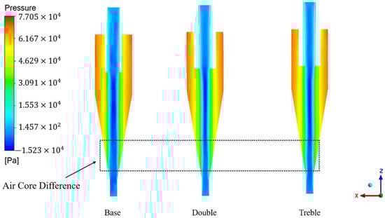 The total pressure within a hydrocyclone primarily consists of static pressure and dynamic pressure. Dynamic pressure is the pressure that reflects the fluid flow phenomena; it acts only in the direction of the fluid’s advance and has a positive value, which can be simply understood as the pressure that occurs after the fluid flows within the pipeline. Static pressure refers to the pressure acting perpendicular to the surface of the fluid and is one of the main pressures during fluid motion [19,20,21]. It significantly influences the energy conversion within the hydrocyclone and operational energy consumption. The effect of the number of internal vortex finders on static pressure in the ZX plane is shown in Figure 4, where the static pressure is highest at the wall and gradually decreases towards the center, becoming negative at the center. This situation is a result of the conversion between pressure energy and kinetic energy and is also the primary reason for the formation of the air core. The influence of the number of internal vortex finders on the characteristics of static pressure variation is relatively minor. To describe the variation in static pressure at a microscopic level, the distributions along three diameters at Z = 70 mm, 150 mm, and 230 mm are examined, as shown in Figure 5. The overall static pressure exhibits a “V”-shaped variation, which is consistent with the static pressure changes in the ZX plane. In the vicinity of the spigot area (Z = 70 mm), the structure with triple vortex finders maintains a higher static pressure. As the axial distance increases, the static pressure of the dual and triple vortex finder structures gradually falls below that of the single vortex finder structure. This variation not only ensures sufficient pressure energy for particles within the conical section but also facilitates the stable discharge of particles from the overflow, thereby enhancing the grading accuracy of the particles.