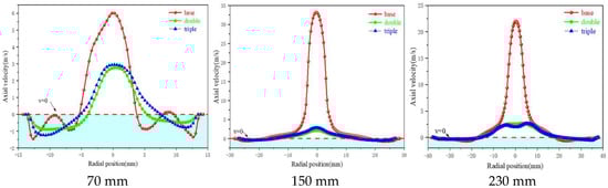 Axial velocity is another important velocity component within the velocity field. The magnitude of axial velocity directly affects the residence time of particles in the hydrocyclone and determines the split ratio (the split ratio refers to the ratio of underflow flow rate to overflow flow rate) [25,26,27]. The effect of the number of internal vortex finders on axial velocity is illustrated in Figure 8. Axial velocity can be positive or negative, with the default direction of internal swirling flow (upward) taken as positive and external swirling flow (downward) considered negative. Additionally, the axial velocity reaches its maximum value in the central region, with a positive direction, indicating that the gas flow direction within the air core is from the spigot to the overflow outlet. At the diameters of Z = 150 mm and Z = 230 mm, the axial velocity of the structure with triple vortex finders is at its minimum. The reduced axial velocity leads to a longer residence time for particles within the hydrocyclone, which is beneficial for the precise classification of fine particles.