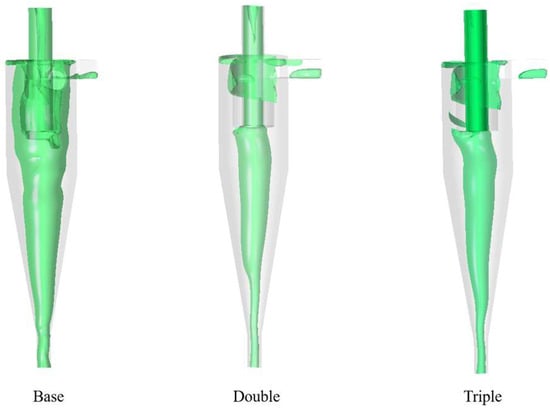 When the direction of axial velocity changes, there will inevitably be points where the velocity is zero. Connecting all these zero points forms the zero-velocity envelope surface (LZVV), which serves as the boundary between internal swirling flow and external swirling flow. It is one of the important flow patterns during the operation of the hydrocyclone and significantly affects the classification performance of the hydrocyclone. The impact of the number of vortex finders on the LZVV is illustrated in Figure 9. The LZVV of conventional hydrocyclones is displaced outward, indicating a larger space for fine particle classification, but with a larger cut size (the particles at the LZVV position are in a state of radial force balance), resulting in reduced cutting capacity of the hydrocyclone. In comparison to conventional hydrocyclones, the LZVV of the dual and triple vortex finder structures shifts inward, enhancing the cutting capacity of the hydrocyclone. Additionally, the shape of the LZVV with triple vortex finders closely resembles that of the inner wall surface of the hydrocyclone, which is more rational. The regular variation of the LZVV indicates smoother particle movement and a more stable internal flow field.