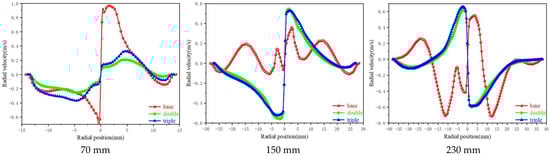 Radial velocity is the lowest velocity within the hydrocyclone and is highly susceptible to external influences. Therefore, employing numerical analysis to investigate the variations in radial velocity within the hydrocyclone is one of the reliable methods. Although radial velocity does not directly affect the classification performance of the hydrocyclone, like tangential and axial velocities, it has a significant impact on the formation of the radial particle layer [28]. The influence of the number of vortex finders on radial velocity is shown in Figure 10. It can be observed that axial velocity exhibits both positive and negative characteristics. This phenomenon arises from the following reasons: in the external swirling flow, the fluid experiences strong centrifugal force due to high rotation speeds, pushing heavy-phase particles toward the walls of the hydrocyclone while also driving the surrounding fluid toward the walls. The internal swirling flow is located in the central region of the hydrocyclone and is influenced by the “compression” from the external swirling flow and the pressure gradient, causing particles near the walls to replenish toward the center to maintain the circulation of the internal swirling flow. This also explains the alternating positive and negative characteristics of the radial velocity. In conventional structures, the variation of radial velocity is more frequent and exhibits poor symmetry, indicating instability in the internal flow field. In contrast, the radial velocity symmetry of dual and triple vortex finder structures is better. At diameters Z = 150 mm and Z = 230 mm, the radial velocity in dual and triple vortex finder structures is greater than that in conventional structures. The larger radial velocity reduces the time taken for particles to form a particle layer in the radial direction, minimizing particle displacement and thereby enhancing the classification accuracy of the hydrocyclone.