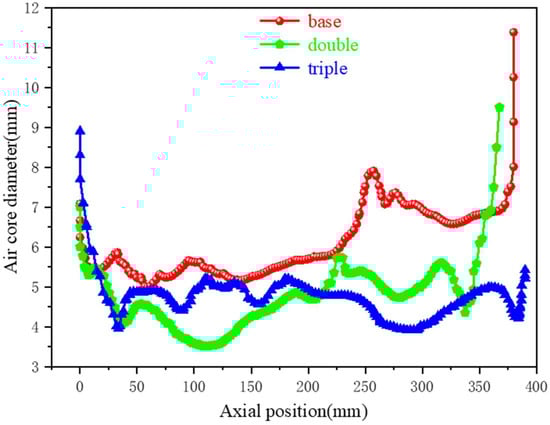 The air core is one of the unique characteristics of a hydrocyclone. During the process of converting pressure energy into kinetic energy, the pressure energy gradually decreases. When the pressure drops below the atmospheric pressure, air is drawn into the center of the hydrocyclone, forming an air core. Although the air core does not participate in particle classification, it occupies the separation space, compressing surrounding particles and indirectly affecting the classification accuracy. The influence of the number of internal vortex finders on the air core is shown in Figure 11. The air core does not have a fixed shape, and its diameter changes frequently, reflecting the vigorous fluid compression on the air. This also indirectly demonstrates that the internal environment of the hydrocyclone is a high turbulence field. The effect of the internal vortex finders on the diameter of the air core is illustrated in Figure 11. The conventional vortex finder structure exhibits a peak at Z = 260 mm (approximately two-thirds the distance from the bottom of the vortex finder), which is commonly referred to as the “throat-like” bulge. This phenomenon arises from multiple convergences in that region. The dual-wall and triple-wall vortex finders effectively eliminate this phenomenon, reducing the impact of convergence on particle movement. Moreover, the air core diameter in the dual and triple vortex finder structures is significantly smaller than that in conventional hydrocyclones, occupying a smaller separation space. Under the same operating conditions, this results in a larger particle separation space, facilitating more thorough classification of the particles.