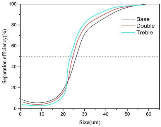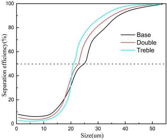 The influence of the number of vortex finders on the classification efficiency of the hydrocyclone is illustrated as shown. From Figure 15, it can be observed that in the underflow, the structure with triple vortex finders has the lowest content of fine particles (particle size less than 10 µm), significantly improving the fine particle bypass phenomenon. As the number of vortex finders increases, the efficiency curve gradually shifts to the left, and the cutting ability gradually enhances. This change is consistent with that shown in Figure 12, confirming the accuracy of the numerical simulation.