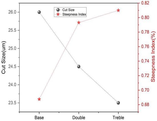 The efficiency curve is one of the important evaluation factors of the classification performance of standard hydrocyclones, representing the recovery rate of particles of different sizes in the underflow [29,30,31]. The influence of the number of vortex finders on classification efficiency is illustrated in Figure 12. As the particle size increases, the recovery rate of particles in the underflow continues to rise, which is consistent with the classification principle of the hydrocyclone. To provide a more comprehensive description of the classification performance of the hydrocyclone, the cut size and steepness index are introduced. The cut size refers to the particle size corresponding to a classification efficiency of 50%, usually denoted as d50. A smaller particle size indicates a stronger cutting ability of the hydrocyclone. The steepness index refers to the slope of the efficiency curve at d50, typically expressed as the ratio of d25 to d75. A higher value indicates greater classification accuracy. The influence of the number of vortex finders on the cut size and steepness index is shown in Figure 13, where the hydrocyclone with triple vortex finders exhibits the smallest cut size and the highest steepness index, indicating that it has the strongest cutting ability and the highest classification accuracy.