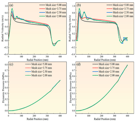 Mesh independence was assessed through transient simulations employing a pressure–velocity coupling solver. Mesh independence analysis was performed with water as the continuous phase and 0.045 mm coal particles as the dispersed phase, under centrifugal conditions of R = 400 mm and ω = 800 r·min−1. Four mesh densities were tested: 70,000 (5 mm), 150,000 (3.75 mm), 300,000 (2.5 mm), and 600,000 (2 mm) cells. As shown in Figure 5a,b present the radial velocity distributions of water and particles at different radial positions, while panels Figure 5c,d illustrate the dynamic pressure distributions of water and particles. The figure indicates that radial velocity distributions differed markedly at 70,000 and 150,000 cells, but became nearly unchanged at 300,000 and 600,000 cells. To enhance computational efficiency while ensuring accuracy, the mesh with approximately 300,000 cells (mesh size = 2.5 mm) was selected for the subsequent simulations.