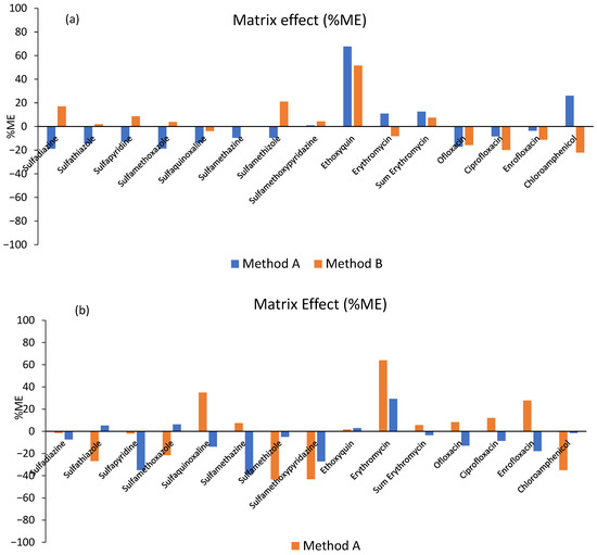 Matrix effects (%ME) calculated from the slopes of the solvent and matrix-matched calibration curves in (a) sea bream samples and (b) fish feed samples.