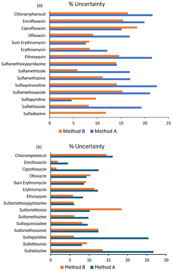 The analytical methodologies were evaluated using the parameters described in Section 2.5, for Sparus aurata and fish feed as matrices. All validation performance parameters of Methods A and B are presented in Table 2 and Table 3, respectively, for fish as well as in Table 4 and Table 5 for fish feed. Method A: Recoveries in all cases ranged at the low spiking level from 62% for sulfamethizole to 97% for sulfapyridine; at the medium spiking level, recoveries were between 73% for sulfamethizole and 93% for sulfadiazine, while at the high concentration level, they were between 74% for sulfamethizole and 102% for ciprofloxacin. High correlation coefficients R2 (>0.9939) were obtained from the calibration curves while LODs and LOQs ranged from 0.2 to 10 ng g−1 and from 0.6 to 25 ng g−1, resulting in high sensitivity of the proposed method. The LOD and LOQ values were below the EU regulation limits for animal-derived food [21,59], which demonstrates the suitability of the developed method for the detection and determination of all the tested antibiotics. Complying with the European Commission Regulation, CCα and CCβ values were calculated after spiking five fish samples with the studied analytes at their MRL level (100 ng g−1). For analytes with no established MRLs such as chloramphenicol and ethoxyquin, the CCα and CCβ values were calculated at the lowest spiking level, at 0.30–0.52 ng g−1 and 0.10–0.20 ng g−1, respectively. Table 6 shows the CCα and CCβ values for fish. Furthermore, the repeatability of the method was satisfactory for all studied compounds below 20% in all cases. Intra-day RSDs (RSDr) ranged from 0.34% to 12.9% and inter-day RSDs (RSDR) from 1.1% to 13.5%. Regarding the matrix effect (ME), as it is shown in Figure 1, the ionization suppression effect was present in most cases between −3.6% for enrofloxacin and −18.7% for sulfadiazine, indicating a low matrix effect, but few compounds showed a moderate enhancement of the signal from up to 26.1% for chloramphenicol. Among all compounds, ethoxyquin exhibited the most pronounced matrix enhancement, with %ME values of +67.6% in Method A, corresponding to a high matrix effect. Coextracted components from biological matrices such as salts (e.g., sulfates and phosphates), carbohydrates (e.g., glucose and nucleotide sugars), amines (e.g., amino acids and urea), and lipids (e.g., cholesterol and triglycerides) increases the matrix effect during the analysis of organic compounds, which is fairly known in the positive ionization mode using ESI and reported in previous studies [11,33]. The results, illustrated in Table S3, indicated PE% values in the range of 47–115%. Finally, the expanded MU was calculated individually for each PhAC, and the results are depicted in Figure 2. MU values for the low spiking ranged between 4.6% for sulfapyridine and 22.5% for sulfaquinoxaline, in medium fortification level from 7.5% for ethoxyquin to 25.2% for sulfathiazole and in the high concentration level from 1.6% for ciprofloxacin to 17.7% for sulfamethizole (Table S3). In all cases, expanded uncertainty values were in accordance with the acceptable expanded MU according to the Horwitz equation (30.1% at 15 ng g−1). In the case of chloramphenicol, the recovery obtained after six replicates at a spiking level of 0.3 ng g−1 was 70%, with a repeatability of 3.6%. The LOD and LOQ values ranged from 0.3 to 1.1 ng g−1, while the associated measurement uncertainty was 36.1% within the acceptable limits defined by the Horwitz equation. For the fish feed matrix, Method A achieved recoveries ranging from 59% to 112% across low, medium, and high spiking levels. Calibration curves showed high linearity (R2 > 0.9894), with LODs and LOQs between 0.98–3.8 and 3.2–12.5 ng g−1, confirming the method’s suitability for antibiotic determination. Repeatability was satisfactory, with intra-day and inter-day RSDs below 19.7%. Most compounds exhibited low ion suppression (−1.5% to −35%) and signal enhancement (1.7% to 35%), although some showed moderate signal enhancement (up to 64%). Process efficiency values ranged between 50% and 121% (Table S4). Expanded measurement uncertainty (MU) values for all fortification levels remained within the acceptable limits defined by the Horwitz equation (≤27.7% at 15 ng g−1).