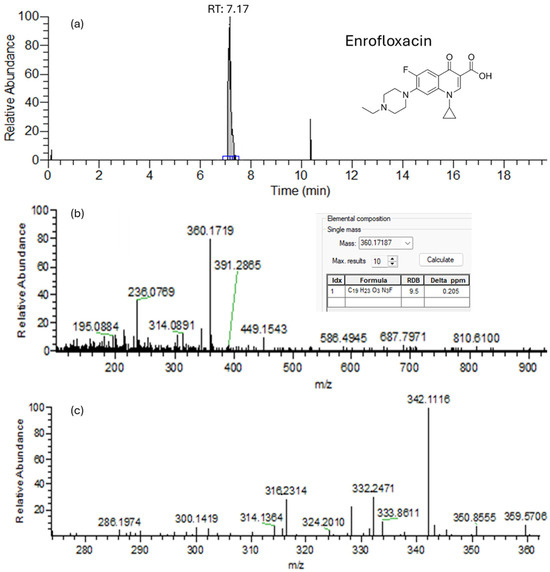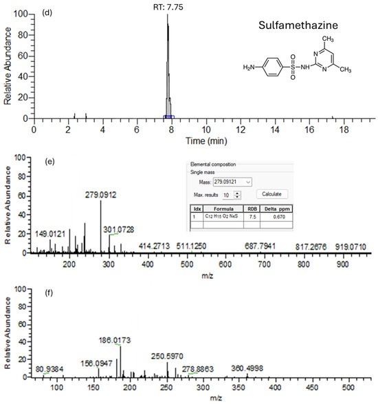 LC-HR-MS-Orbitrap mass spectra for the detection of enrofloxacin in sea bream sample: (a) extracted ion chromatogram, (b) full scan MS, (c) MS2 fragment ion and sulfamethazine in feed sample, (d) extracted ion chromatogram, (e) full scan MS, and (f) MS2 fragment ion.