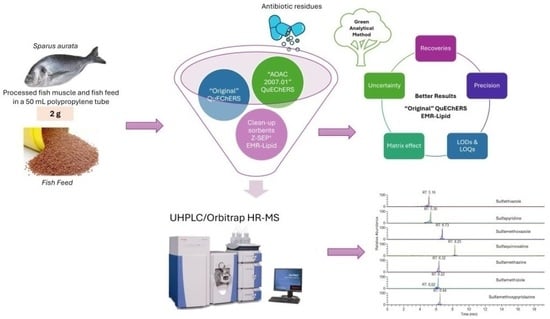 - Aissaoui, Y.; Jiménez-Skrzypek, G.; González-Sálamo, J.; Trabelsi-Ayadi, M.; Ghorbel-Abid, I.; Hernández-Borges, J. Determination of Multiclass Antibiotics in Fish Muscle Using a QuEChERS-UHPLC-MS/MS Method. Foods 2024, 13, 1081. [Google Scholar] [CrossRef]