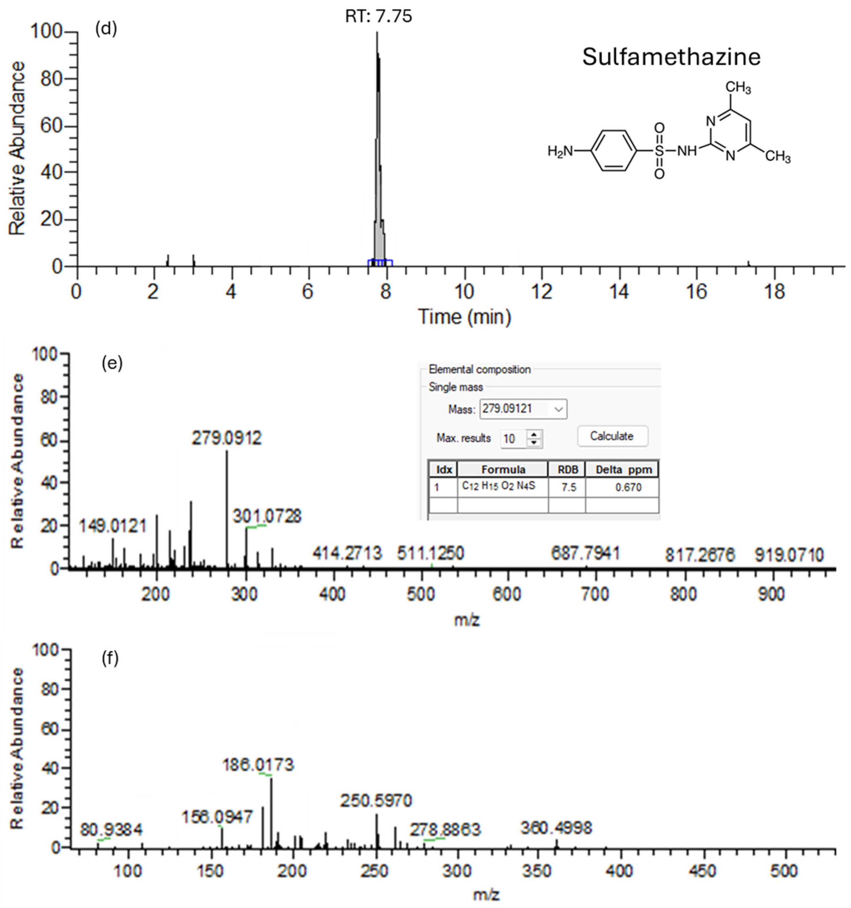 | Sulfamethazine | 7.40 | C12H14N4O2S | 278.330 | 279.0910 | −0.743 | 7.5 | 186.0614/156.0796 |