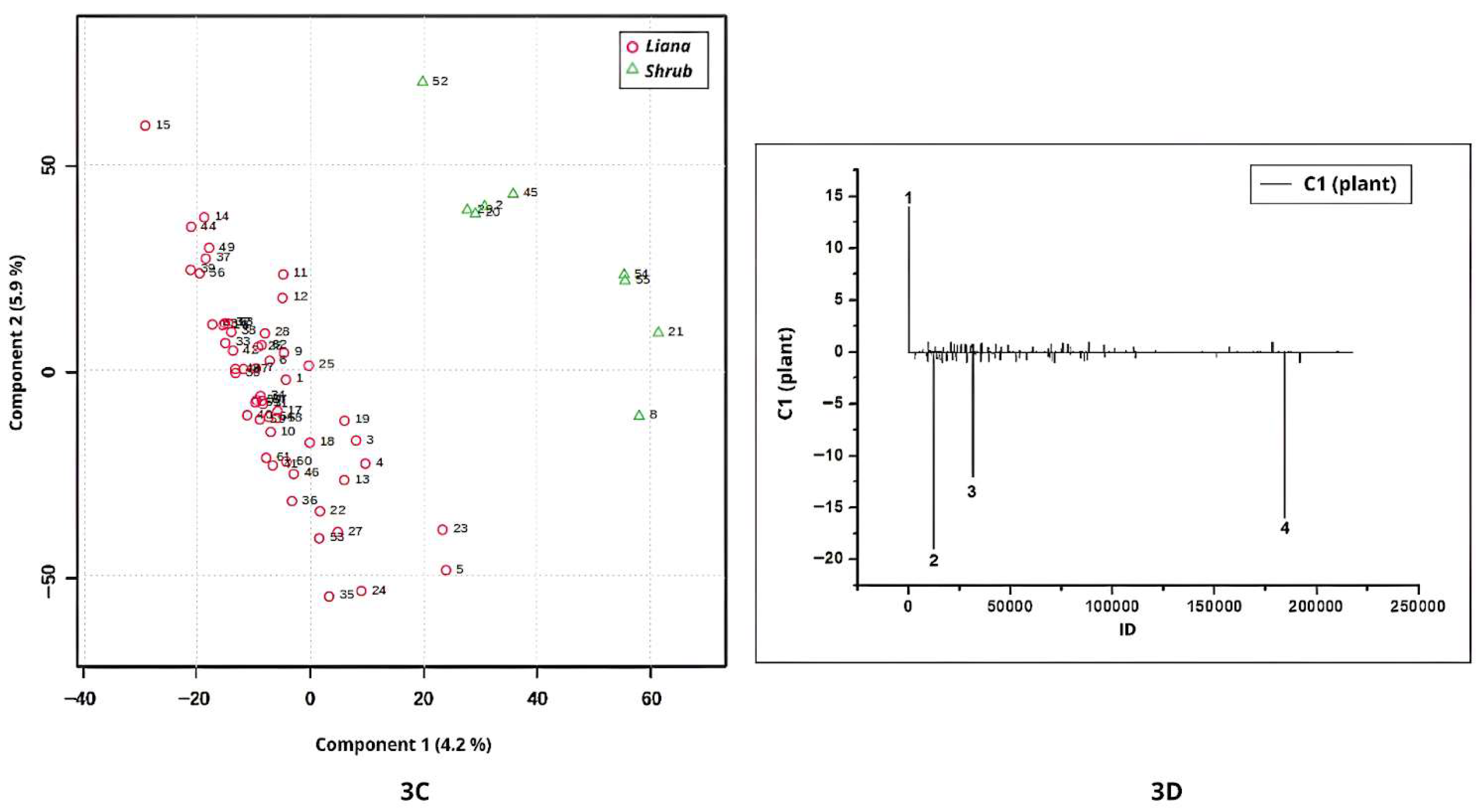 Figure 3A) were associated with liana samples. Three compounds contributed to the separation between lianas and shrubs: peak 2 (ID = 18390;