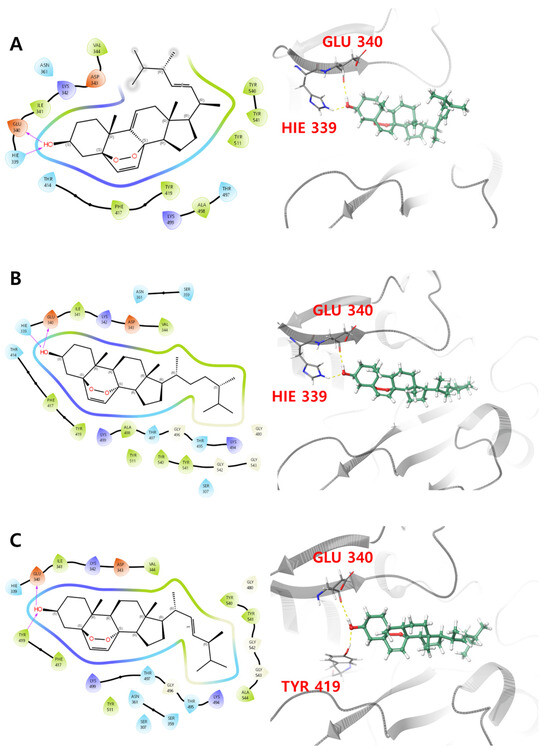 Compounds 1–3 all exhibited the highest binding affinity with penicillin binding protein 3 (PDB ID: 7ONW), with values of −62.89, −75.94 and −74.47 kcal/mol, respectively, where binding affinities with other proteins ranged from −40 to −60 kcal/mol. PBP3 contains a transpeptidase module with an active site that drives its transpeptidase activity. This is primarily dependent on eight key residues, Ser 307, Lys 310, Ser 359, Asn 361, Lys 494, Thr 495, Gly 496 and Thr 497, which are crucial for the binding of β-lactam antibiotics to the active site of PBPs [47]. As shown in Figure 3A and Table 3, primary interactions between PBP3 with 3-OH of compound 1 were observed, via H-bonds with Glu 340 and Hie 339. Identical H-bond interactions were observed for compound 2, and H-bonds between Glu 340 and Tyr 419 residues with the 3-OH of compound 3 were observed (Figure 3B,C). Additionally, the prime energy, which reflects structural stability, was observed to be −19,514.4, −19,488.1 and −19,511.0 kcal/mol, respectively, for compounds 1–3, respectively. Compound 2 showed slightly higher prime energy than compounds 1 and 3, suggesting the possibility of adopting a less stable pose with the protein.