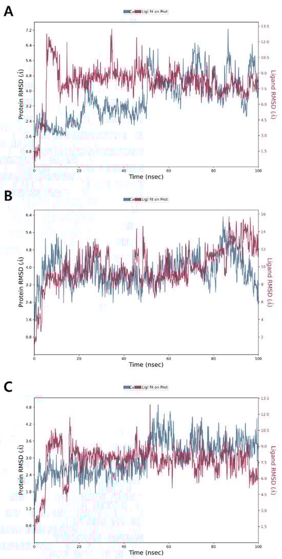 The RMSD of the PBP3 Cα backbone complex with 1 showed an initial increase during the first 10 ns, after which it stabilized over the subsequent 50 ns. However, further fluctuations were observed between 60 ns and 100 ns, suggesting a dynamic equilibrium with minor instability toward the end (Figure 4A). For compounds 2 and 3, the RMSD showed an initial increase during the first 10 ns, followed by stabilization with minimal dynamic fluctuations throughout the remaining simulation period, indicating relatively stable binding interactions (Figure 4B,C). The average RMSD values for the backbone of PBP3 complexes with compounds 1, 2 and 3 were approximately 3.6, 3.8 and 3.0 Å, respectively. An RMSD of around 3.0 Å suggests that the ligand–protein complex adopts a conformational state with partial structural alignment to the native pose [48]. This indicates significant conformational flexibility, reflecting a non-ideal yet not fully unstable interaction of compounds 1–3 with PBP3.