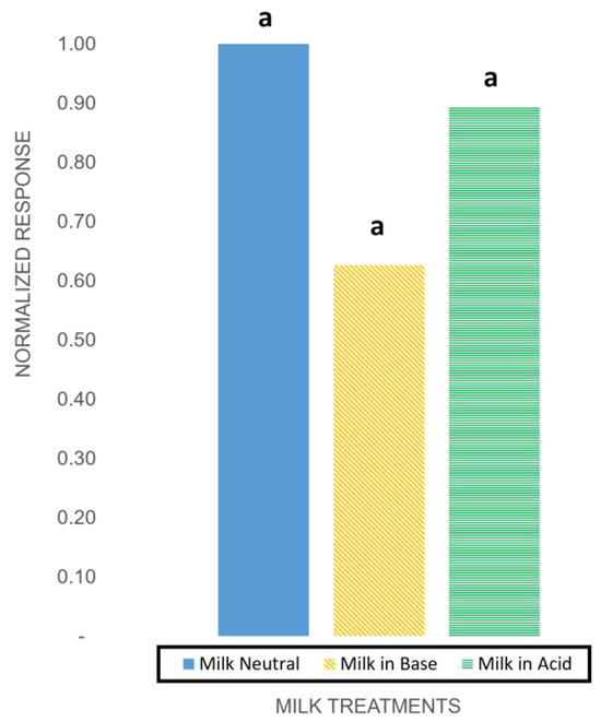 BPA recovery (based on instrument response) under neutral (MN), basic (MB), and acidic (MA) conditions. MA and MB results were normalized and compared to MN; therefore, the standard deviation was excluded from the dataset (n = 8). Statistical analysis revealed that the data did not follow a normal distribution, and a non-parametric test revealed no statistically significant difference across treatments (p.adj-value > 0.05). The same letter above each treatment indicates no significant differences at Tukey’s test (p ≤ 0.05).