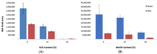 Recovery of BPA from different solvents using SBSE: (A) BPA recovered from water and milk samples with 0%, 10%, and 30% of ACN, and (B) BPA recovered from water and milk samples with 0%, 10%, and 30% of MeOH. BPA recovery was based on the instrument’s response, i.e., BPA peak area in the chromatograms. Data are means of three replicates ± standard error (error bar).