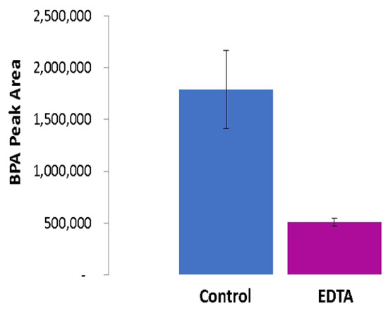 Particles known as casein micelles constitute the largest protein component found in most types of milk [38,39]. These casein micelles form complexes with important minerals, including calcium. It has been reported that EDTA can disrupt casein micelles by destroying their calcium core, subsequently freeing any entrapped protein from casein aggregates [40]. The key interactions that are considered to be involved in maintaining the caseins are hydrophobic interactions, electrostatic attractions, and Ca bridges [41]. Alteration of protein–mineral equilibria by chelation was also demonstrated in a study by McCarthy et al. [42], where various calcium-chelating agents were found to impact the physical properties of milk powder concentrate dispersion, thereby increasing its solubility. Even though other studies have shown that EDTA can induce the dissociation of casein [41,43], our results indicate that this phenomenon is ineffective at improving BPA recovery from milk. As seen in Figure 5, BPA recovery from milk was greatly impaired by the addition of EDTA. We suspect that under high-temperature conditions, milk can increase the release of denatured whey proteins [41] and the whey proteins can absorb BPA, resulting in a decrease in BPA extraction [44].