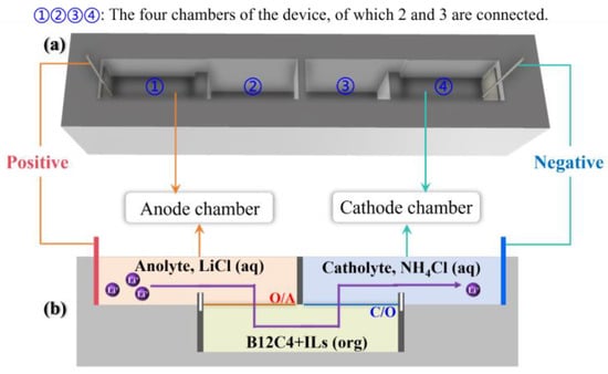 LiCl solution (6 mL, anolyte) is injected into the anode chamber (chamber ① shown in Figure 1a) and connected to the positive electrode of the DC power supply. NH4Cl solution (6 mL, catholyte) is injected into the cathode chamber (chamber ② shown in Figure 1a) and connected to the negative electrode of the DC power supply. The electrodes are made of platinum wire. The organic solution (6 mL) consists of [EMIm][NTf2] (30% by volume) and B12C4 dissolved in anisole (70% by volume).