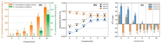 Figure 2a shows that the Li+ concentration in the organic solution increases uniformly with the increase in the current, and the Li+ concentration in the catholyte is extremely low in 0–6 mA, with small fluctuations. Only when the current reaches 8 mA does the Li+ concentration increase significantly, i.e., 2.18 mg/L, 34.33 mg/L and 131.70 mg/L at 6 mA, 8 mA and 10 mA, respectively. The decisive factor for the rate of Li+ migration into the catholyte is the dissociation of chelated Li+ in the organic solution. The above phenomenon shows that when the current reaches over 8 mA, the chelated Li+ in the organic solution begins to dissociate in large quantities, while Li+ migrates into the catholyte significantly, as shown in Figure 2a.