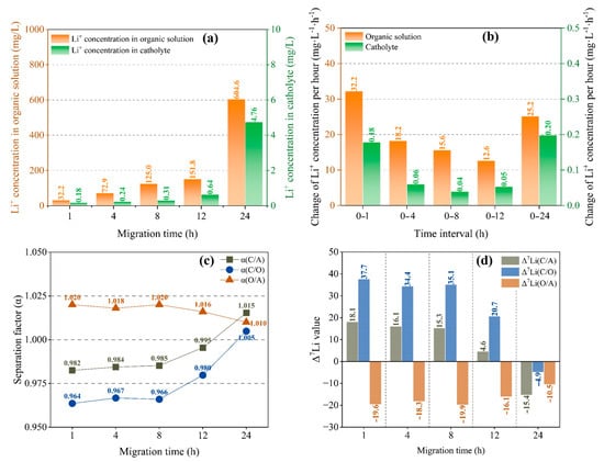 It can be seen from Figure 3a that the concentration of Li+ in an organic solution and catholyte changes with migration time in the same way, with slow growth at 0–12 h and rapid growth at 12–24 h. For the organic solution, although the concentration of Li+ increases with the duration of migration in the first 12 h (Figure 3b), the quantity of Li+ migrating into the organic solution per unit time decreases, which indicates a slowing down of the migration rate of lithium ions. However, as time goes by, the migration rate of lithium ions increases again. The change in Li+ content in the catholyte (Figure 3b) is similar to that in the organic solution.