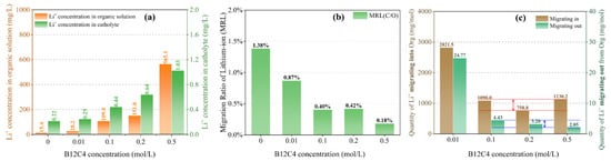 Li+ concentration in organic solution and catholyte (a); the MRL (b) and change in Li+ quantity per mole of crown ether (c) with different B12C4 concentrations at a current of 4 mA, a migration time of 12 h and a LiCl concentration of 1 mol/L (The red and blue lines indicate the fluctuation ranges).