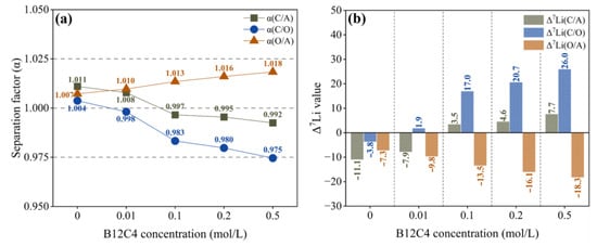 Separation factor (a) and Δ7Li (b) with different B12C4 concentrations.