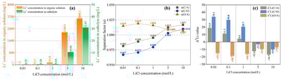 In addition to chelating effect and electric field force, the migration of Li+ is also affected by diffusion effect, which is closely correlated to the Li+ concentration difference on both sides of the interface. Therefore, increasing the initial concentration of lithium salt in the anolyte is conducive to Li+ migration. It is not difficult to see from Figure 6a that with the increase in LiCl concentration, Li+ molecules moving into the organic solution continue to increase. When the LiCl concentration is lower than 1 mol/L, the change is not obvious, but when it reaches 5 mol/L, there is a significant increase (from 151.8 mol/L to 2168.4 mol/L). As shown in Figure 6a, Li+ concentration in the catholyte is closely correlated to that in the organic solution, which also increases significantly with an increase in Li+ concentration in the organic solution. This suggests that the diffusion effect becomes dominant after the initial LiCl concentration reaches about 5 mol/L.