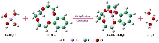 According to our previous research [], in this method, the separation of lithium isotopes usually occurs during lithium-ion migration. During the process of migration, Li+ is subjected to chelating, the electric field and diffusion. The direction of the electric field and diffusion is the same as that of Li+ migration, which promotes the transfer of Li+. However, chelating always points towards the organic solution, such that chelating promotes Li+ migration into the organic solution but impedes Li+ migration out of the organic solution. The process of complex formation is shown in Figure 7.