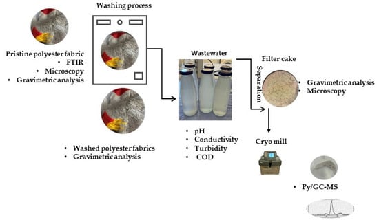 The characterization of the filter cakes labeled as 1*, 2*, 3* and 4*, which were isolated from wastewaters presented in Table 1 via the filtration process, was conducted using gravimetry, microscopy, and Py-GC/MS methods. The washing protocol and methods for the analysis of the polyester fabric, wastewaters and filter cakes are presented in Figure 1.