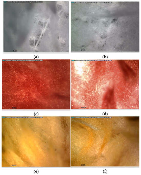 Digital images of the structural units of the complex structure, magnification 50× (a) front side of the white basic fabric with the grey pile, (b) the back side of the white basic fabric with the grey pile, (c) the front side of the red pile, (d) the back side of the red pile, (e) the front side of the yellow pile, (f) the back side of the yellow pile.