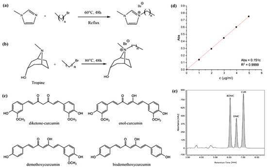 Synthesis routes of (a) imidazolium and (b) tropine-based ILs; (c) different structures of curcumin and related curcuminoids; (d) UV−Vis calibration curve of curcumin; and (e) HPLC (High Performance Liquid Chromatography) chromatogram of curcuminoids (CUR: curcumin, BDMC: bisdemethoxycurcumin, and DMC: demethoxycurcumin).