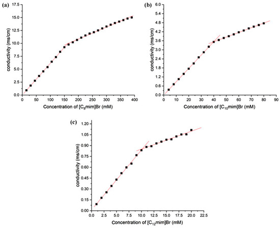 The relationship between conductivity and concentration of imidazolium ILs in aqueous solution (25 °C, (a) [C8mim]Br, (b) [C10mim]Br, and (c) [C12mim]Br).