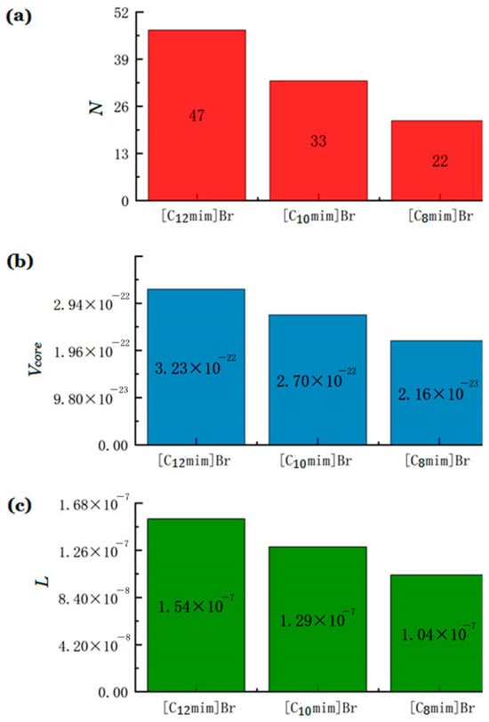 where L is the length of the alkyl chain embedded in the core of the micelle; ncore is the carbon number in the core. For ionic liquids [Cnmim] Br (n = 8, 10, and 12), ncore ≈ nc − 1, where nc is the number of carbon atoms in the carbon chain [37]. The calculated aggregation number (N) and volume of single hydrocarbon core (Vcore) and the length of the carbon chain in the micelle core (L) of imidazole ionic liquids [Cnmim]Br (n = 12, 10, 8) are shown in Figure 3. The longer the carbon chain of ionic liquids, the greater the aggregation number of micelles, and the larger the micelle size. Here, the solvent is water as the polar component, and long alkyl-chain-substituted ILs represent less-polar component as surfactant. When the length of alkyl chain becomes longer, the degree of “dissimilarity” between solvent and surfactant is more significant. On the one hand, increasing the length of hydrophobic chains can lead to a decrease in the water solubility of surfactant monomers, thereby reducing the CMC of surfactant [38]. On the other hand, the surfactant with a longer hydrophobic chain has a higher aggregation number, resulting in larger micelle size and a greater space of the core [39].