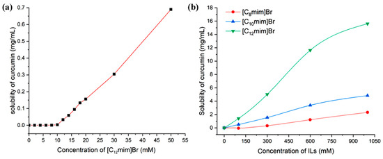 During the extraction process, using those solvents with a significant solubilization effect can reduce the volume of extractant used and decrease energy consumption and post-treatment burden, thereby improving extraction efficiency. The strengthened solubility of curcumin by ionic liquids is closely related to the aggregation behavior of the ionic liquids themselves. Therefore, the concentration of ionic liquids has a significant impact on the solubility of curcumin, as shown in Figure 4a. When the concentration of [C12mim]Br is below CMC (measured by conductivity method as 10.2 mM), curcumin is almost insoluble. When the concentration exceeds CMC, the solubility significantly increases. This indicates that the solubilization of curcumin by [C12mim]Br is a micelle phenomenon [39].