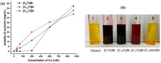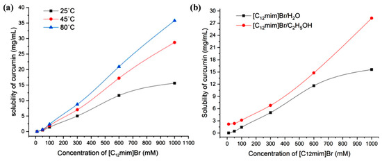 On the basis of the above research, considering that ethanol is often used in combination with ionic liquids, we also investigated the solubility of curcumin in imidazole-type ionic liquid ethanol solutions. Due to the good dissolution effect of ethanol on curcumin, using ethanol instead of water to prepare [C12mim]Br ethanolic solution may achieve a better solubilization effect. The relevant experimental results are shown in Figure 5b. At low concentrations, the solubility of curcumin in [C12mim]Br ethanol solution is similar to that in pure ethanol. When the concentration of [C12mim]Br exceeds 50 mM, the solubility begins to significantly increase. Overall, the solubility of curcumin in [C12mim]Br ethanolic solution is higher than that in [C12mim]Br aqueous solution.
