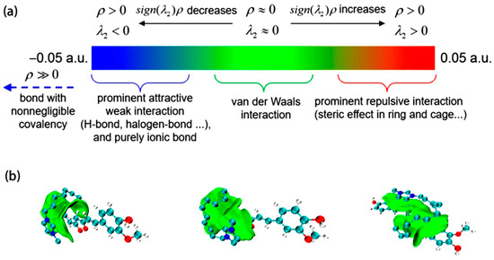 In order to further understand the intermolecular interactions between the tested ILs and Cur, Gaussian09W was used to optimize the structures of curcumin and three ionic liquids—[C8mim]Br, [C10mim]Br, and [C12mim]Br. Initially, the molecular structures of curcumin and the ionic liquid cation were constructed using GaussianView. Subsequently, the DFT-B3LYP method with the 6-31G(d,p) basis set was applied. The system charge was set to +1 to execute the structural optimization. Analyses of weak interactions were performed using the IGMH method implemented in the Multiwfn software (version 3.8) [40,41]. This quantum chemistry-based approach employs the second-largest eigenvalue (λ2) of the electronic density Hessian matrix, projecting it onto wavefunction eigenvalues that characterize interactions between atoms, among fragments, and within fragments. This procedure generates a color-coded interaction trend map, as illustrated in Figure 7a [42]. The resulting wavefunction data were visualized using VMD software (version 1.9.4a53), producing the depiction shown in Figure 7b. The analysis preliminarily indicates that van der Waals forces are the primary interactions between curcumin and the three ionic liquids, while hydrogen bonds are relatively weaker or nonexistent.