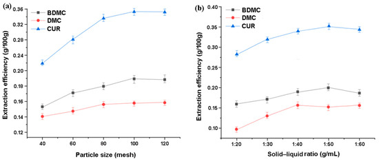 (a) The effects of the raw material size and (b) solid−liquid ratio on the extraction of curcuminoids.