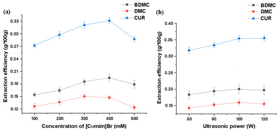 To achieve rapid extraction, the solvent’s ability to dissolve the extract and the rapid mass transfer ability of the target substance in the solvent are very important. On the one hand, the solubility of curcumin increases with the increase in ionic liquid concentration. If the concentration of the ionic liquid in the extraction agent is too low, the extraction effect will obviously not be good. On the other hand, the viscosity of the extraction agent will also increase with the increase in ionic liquid concentration, and a too-high viscosity will hinder mass transfer and be unfavorable for extraction. Choosing the appropriate concentration of ionic liquids is crucial for the extraction of curcuminoid substances. Under the same conditions, different concentrations (100–500 mM) of ionic liquids were used as extractants for extraction comparison. In the investigation on IL concentration, the extraction temperature was 30 °C, and the 100 W ultrasonic extraction time was 30 min. Figure 9a shows the trend of the extraction efficiency of curcuminoids with the concentration of ionic liquid [C12mim]Br. It can be proved that 400 mM of [C12mim]Br is enough to achieve the satisfied extraction for the targets.